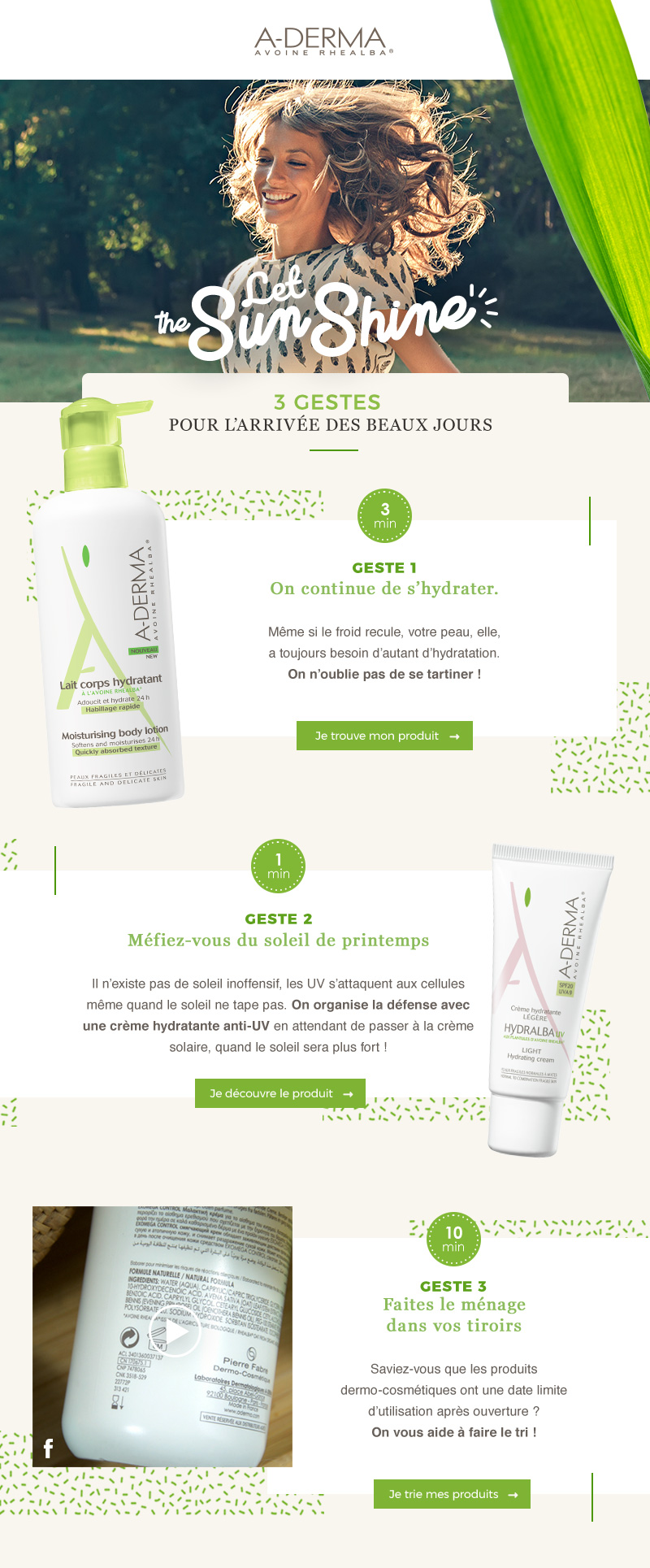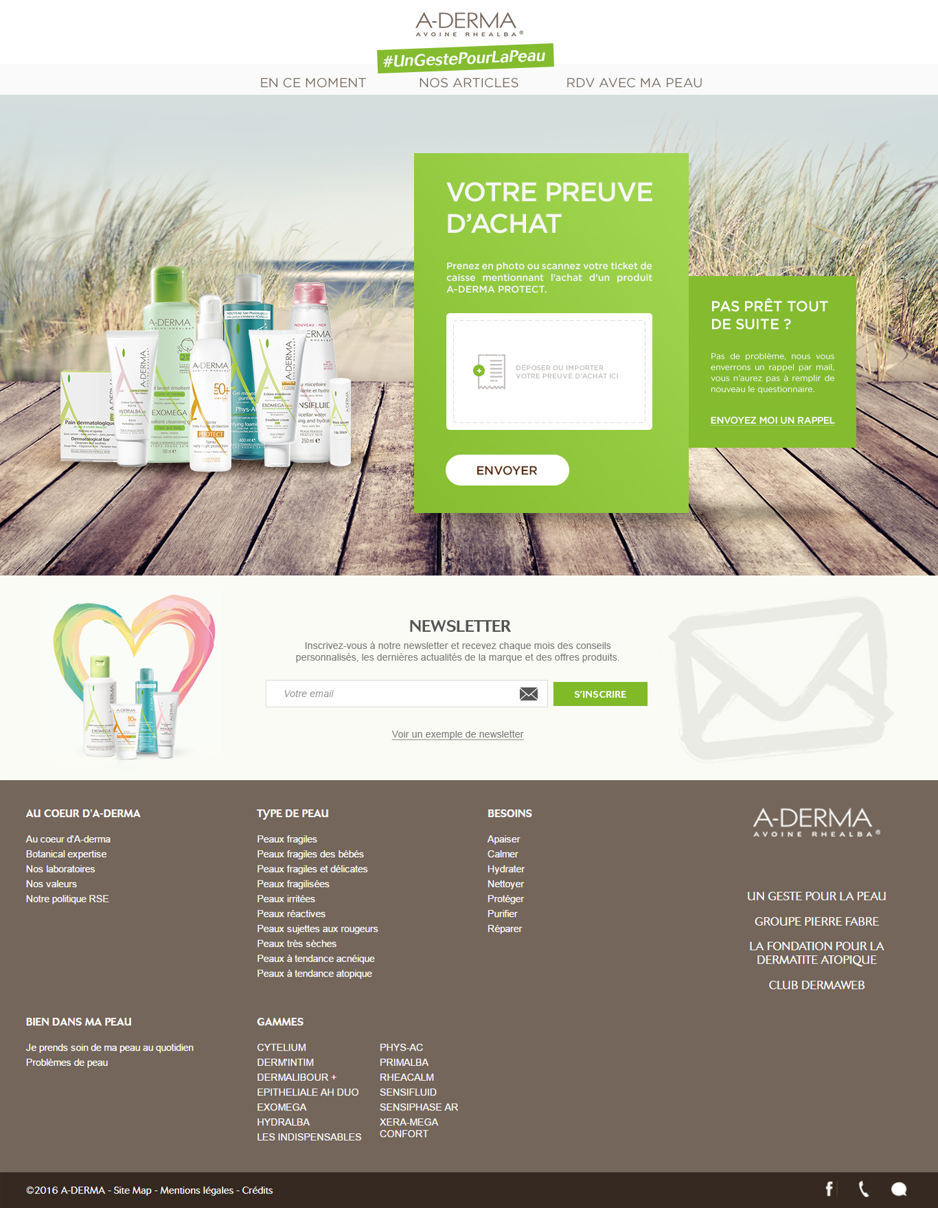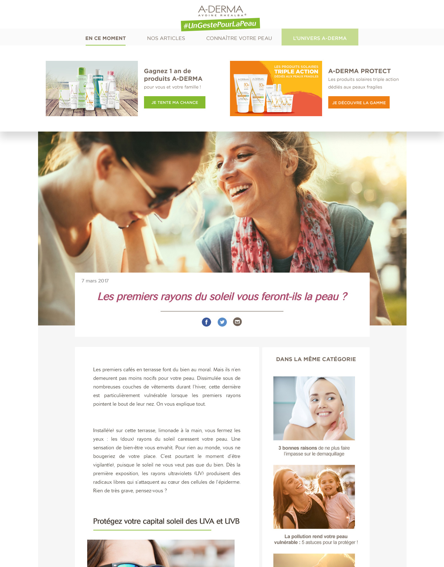 Dispositif mis en place à l'été 2017 pour le lancement des nouveaux produits solaires A-Derma. Partant du constat que les françaises passaient plus de temps à choisir leur maillot de bain que leur crème solaire, nous avons mis en place un questionnaire ludique afin qu'elles puissent trouver la protection la plus adaptée à leur peau et à celle de leur famille. Ainsi qu'une campagne RS mettant en avant le sac de l'été de divers influenceuses contenant la protection solaire qui leur était destinée.
