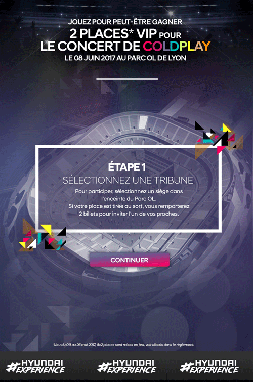 Hyundai invita 10 de ses clients à assister en loge VIP au concert de Coldplay à Lyon, grâce un mini-jeu permettant de retrouver 10 places gagnantes disséminées dans les tribunes du stade.