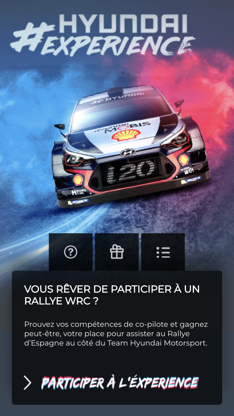 Fort d'une notoriété grandissante en WRC, Hyundai proposa à 10 de ses clients de gagner ce magnifique séjour en mettant en place une activation Le jeu basé sur le gameplay de Guitar Hero fut développé en moins de 2 semaines et rencontra un vif succés.